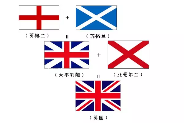 英国“米字旗”由三个十字旗组合而成,这三个十字旗分别是英格兰旗,苏格兰旗(这两者组成大不列颠旗)以及北爱尔兰旗(圣帕特里克旗)